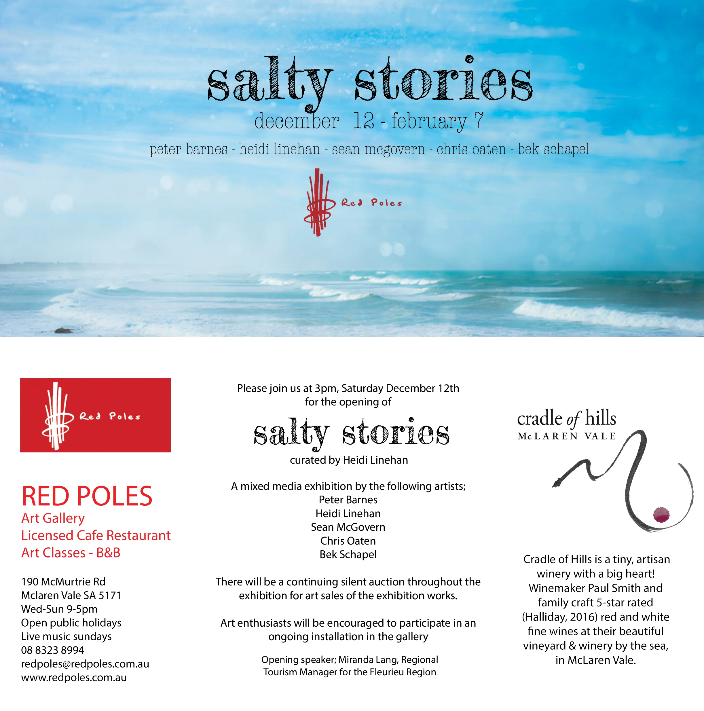 Salty Stories will be retired from Red Poles in McLaren Vale soon. We are going to have a closing party to finalise bids and farewell the artwork in style. Come join us SUNDAY 7TH FEB AT 4PM - maybe you could pick up a bargain! And remember, part proceeds go to Sea Shepherd.